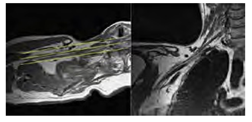 | Coronal Obl T1 -weighted FSE (midclavicle to midclavicle) | 2 | 2.5 | 790/10 | 4 | 150 | 320 x 376 |