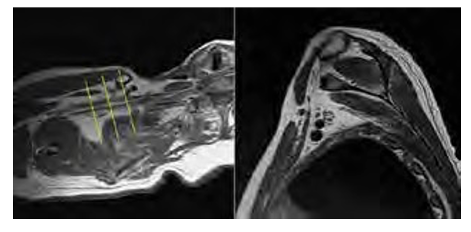 | Sagittal Obl T1-weighted FSE (affected side) | 4 | 5 | 700/10 | 3 | 180 | 320 x 240 |